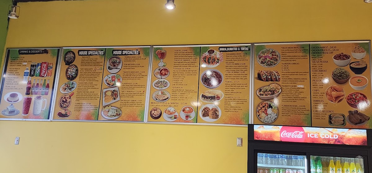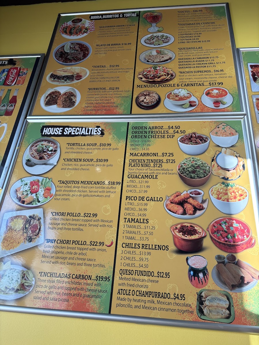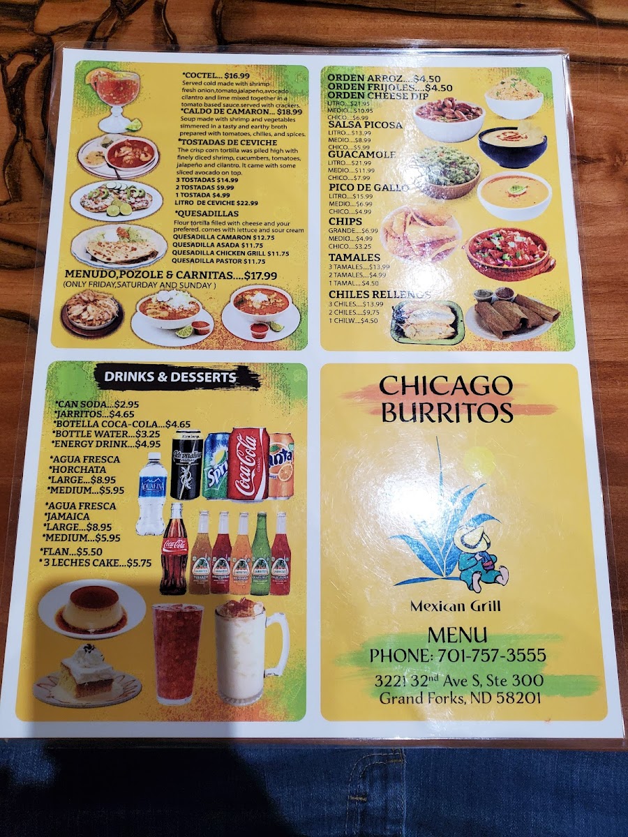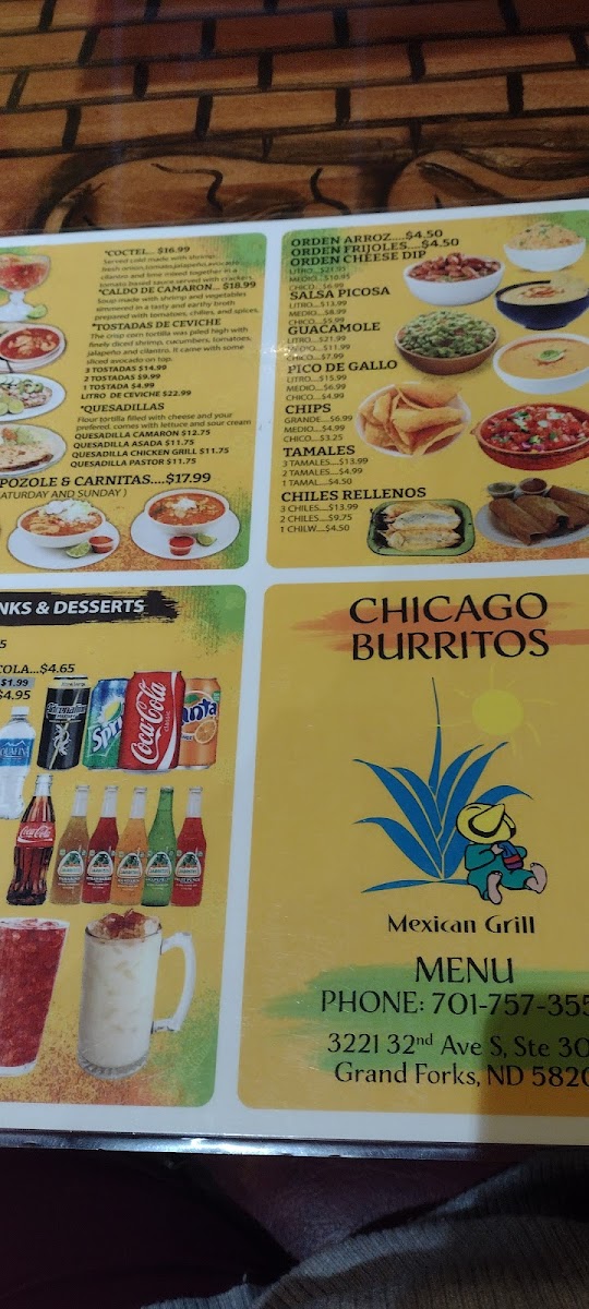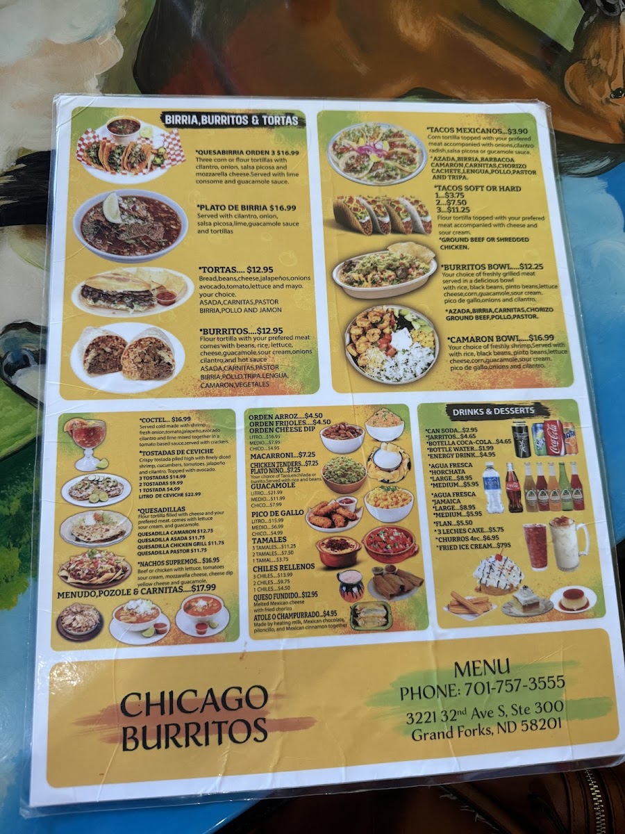 The menu at Chicago Burritos offers a delightful array of Mexican dishes that cater to various tastes. For those craving classic Mexican street food, Tacos Soft or Hard (3 for $8.99) or a single taco ($2.99) are popular choices. The Birria and Burritos & Tortas options offer satisfying, flavorful meals, with a variety of fillings to choose from. Additionally, the Quesadillas and Coctel are great for a lighter bite. For something more substantial, the Camaron Bowl provides a seafood twist. House specialties like Buffalo Wings, Taquitos Mexicanos, and Camarones A La Diabla (spicy shrimp) are flavorful highlights. The Chimichanga and Chiles Vallartas provide a satisfying, hearty option with a little heat. On the sides menu, you can enjoy crispy Chicken Tenders or enhance your meal with extra toppings or Atole O Champurrado. Don’t forget the essentials like Chips & Salsa and creamy Guacamole. For dessert, treat yourself to a slice of Flan or indulge in a rich 3 Leches Cake. Refresh with a cold Jarritos or Agua Fresca in flavors like Jamaica. Whether you're in the mood for something light or filling, Chicago Burritos offers a menu that satisfies all cravings.