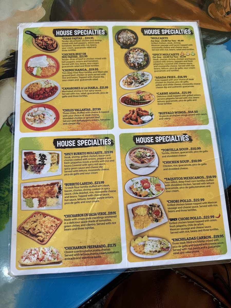 Steak, chorizo, shrimp, chicken and bacon cooked with onions, peppers and fresh jalapeños. Covered with cheese sauce, and mozzarella cheese. Served with rice beans, lettuce, pico de gallo, sour cream guacamole and tortillas.