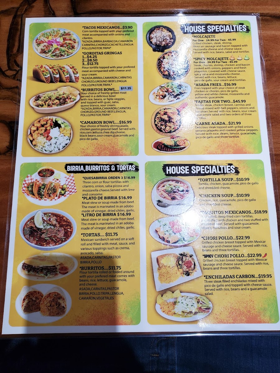 Flour tortilla with your preferred meat comes with beans, rice, lettuce, cheese, guacamole, sour cream, onions cilantro, and hot sauce. Asada, carnitas, pastor, birria, pollo, tripa, lengua, camaron, vegetales.